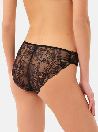 Delicato reggiseno a triangolo con coppa morbida in pizzo elastico e rifinito in tulle. Caratterizzato da spalline sottili regolabili e chiusura con gancetto sul retro che conferiscono un sostegno leggero ed una personalizzazione della vestibilità.